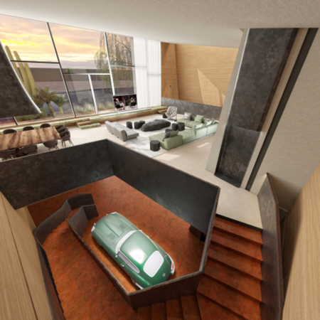 Descending from the gathering hall, a staircase clad in patinated metal leads into the exclusive garage beneath the majlis. Designed for an avid collector, this subterranean chamber is far more than storage. It is a curated exhibition space where polished concrete floors and rammed earth walls create a setting of solidity and permanence. Skylights and integrated lighting illuminate the sculptural forms of the vehicles, transforming them into art pieces. The garage embodies the project’s theme of celebrating personal passion through architectural expression, turning an ordinarily functional space into a dramatic destination.
